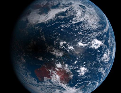 The Moon’s shadow engulfs Indonesia just after local sunrise. Photo credit: Japan’s Himawari-8 meteorological satellite (reprinted from space weather.com)